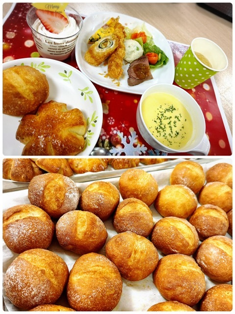 2025年12月21日(日) クリスマス会!! クリスマス会を行いました!!早い時間から厨房さんが丹精込めて調理してくださいました(^^♪最近、評判となっている手作りパンも添えました♪ [トップに戻る]